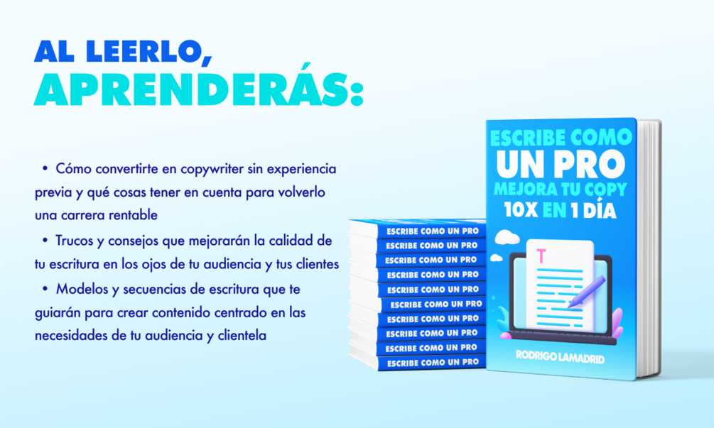 En ‘Escribe como un PRO: Mejora tu copy 10x en 1 día’, encontrarás los mandamientos que yo sigo al escribir y que me han generado más de $1,000,000 MXN como copywriter freelance.